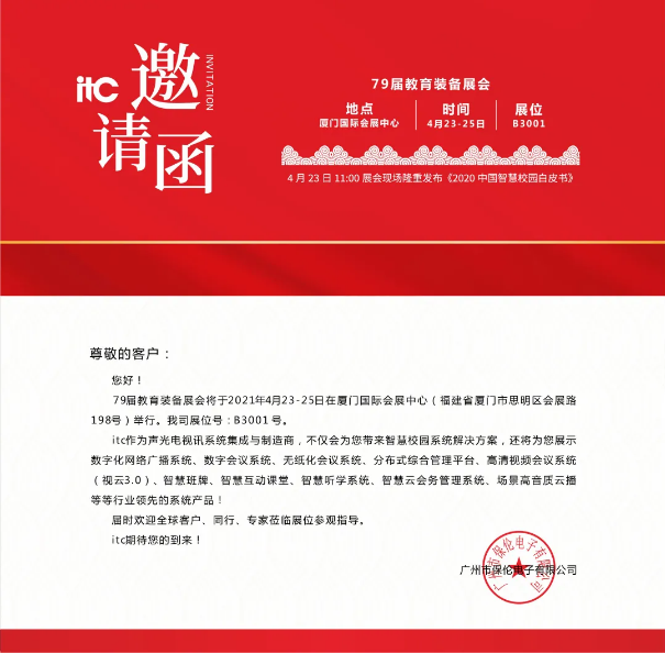 itc正在籌備的廈門教育技術裝備展覽會即將盛大開幕,將要展出云廣播、云視訊、高清錄播、校園空間展示平臺、IOT教研工具包等產品及解決方案,為廣大客戶提供智慧教育整體解決方案,助力教育信息化建設,4月23日—25日,廈門國際會展中心B3001號,不見不散。
