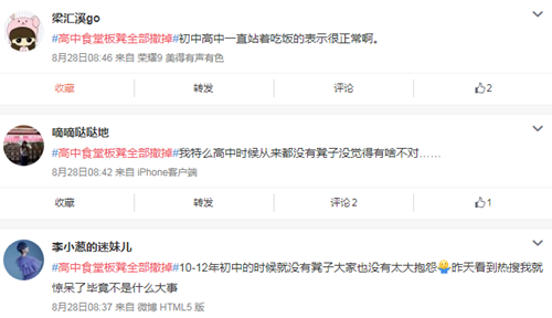 “站著吃飯”并非個(gè)例。全國(guó)有很多學(xué)校或是由于經(jīng)費(fèi)有限導(dǎo)致基礎(chǔ)后勤設(shè)施不到位、或是出于“提高學(xué)生用餐效率”的初衷主動(dòng)撤掉了凳子,從網(wǎng)友的留言中可見(jiàn)一斑: