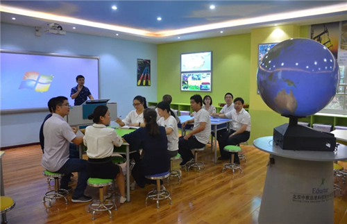 期間,主講老師齊悅就地理專用教室所涉及的功能應用、設備操作技能、如何使課程資源與教學相結合、保養維護等各個方面進行講解、演示,整個培訓過程中,老師們積極一邊聽講一邊動手操作,很快就學會了設備的操作和使用,并且表示會利用課余時間再來進行摸索鞏固,熟練操作流程,以便能盡快組織學生來開展教學活動。