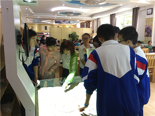 當同學們堆砌沙盤內的沙子時,追蹤器能捕捉沙子的形態變化,投射的色彩和等高線也會發生相應的變化。學生既能在動手操作中直觀感受不同地形的形態,又能在反復實驗、細致觀察中理解抽象復雜的等高線知識,在真實可感、充滿趣味的探究活動中提高地理實踐力。