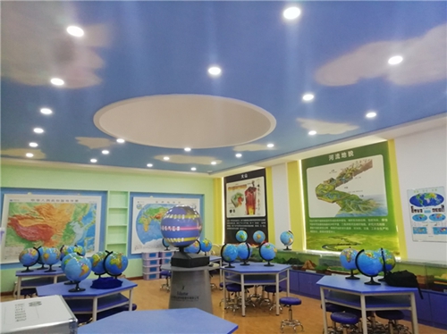 靖遠二中數字化地理專用教室配備了中教啟星數字星球系統、交互地圖教學系統、語音立體地形圖等數字化交互教學設備,以及地理圖層學習箱、地理交互式學具、仰望星空快樂成長課程包等實驗教學設備和相關教學課程,并通過地理知識窗簾、掛圖、穹頂等環境設計為師生們營造濃厚的地理教學氛圍。