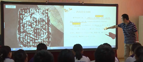 歷史交互教學(xué)系統(tǒng)通過(guò)超寬屏投影、集成多點(diǎn)觸控實(shí)現(xiàn)多種資料同時(shí)呈現(xiàn)的效果,具有震撼的視覺(jué)效果和強(qiáng)大的實(shí)時(shí)交互功能。該系統(tǒng)軟件為歷史教師提供了歷史工具、歷史專用板書(shū)以及畫(huà)筆軟件。