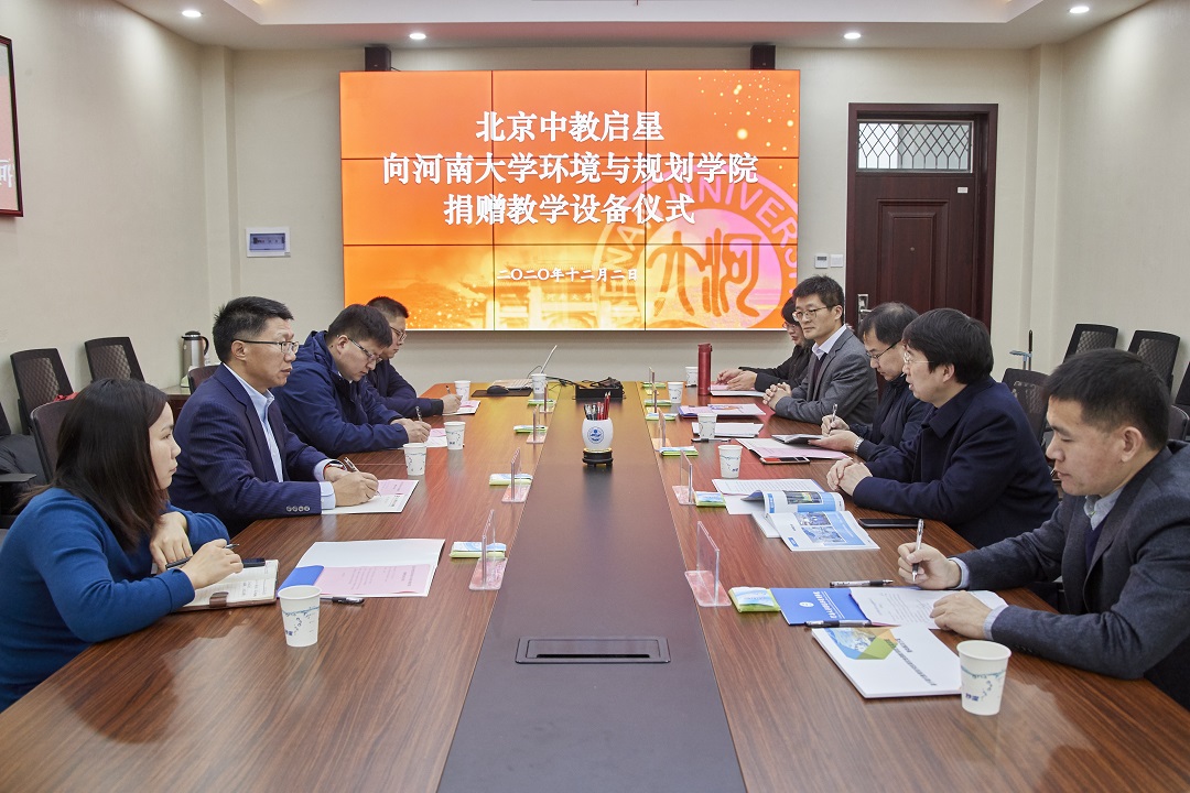 12月2日,在八朝古都開封,中教啟星向河南大學環境與規劃學院捐贈教學設備儀式在該學院舉行,中教啟星總裁王天祥,教研中心總監王秋平,渠道部總監馬爭科,河南省銷售負責人楊秉奮,河南大學環境與規劃學院黨委書記鄭洪濤,執行院長、黨委副書記喬家君黨委副書記徐小軍,副院長潘少奇,地理科學系教師張廣花等領導出席了本次捐贈儀式。