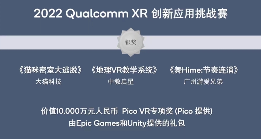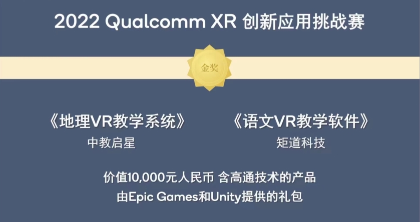 “2022 Qualcomm XR 創(chuàng)新應(yīng)用挑戰(zhàn)賽”整個賽程共設(shè)立10組賽道,41個獲獎名額。自3月17日正式啟動報名以來,先后收到了超過450來自海內(nèi)外XR領(lǐng)域的參賽作品,大賽評審從最終提交的230多個符合大賽要求的作品中,評選出70多個優(yōu)秀參賽作品入圍決賽環(huán)節(jié),最終有39個優(yōu)秀參賽作品分別獲得本屆大賽白金獎、金獎和銀獎。北京中教啟星科技股份有限公司的地理研學(xué)VR教學(xué)系統(tǒng)榮獲VR行業(yè)組產(chǎn)品金獎,并在PICO VR專業(yè)組中斬獲銀獎。