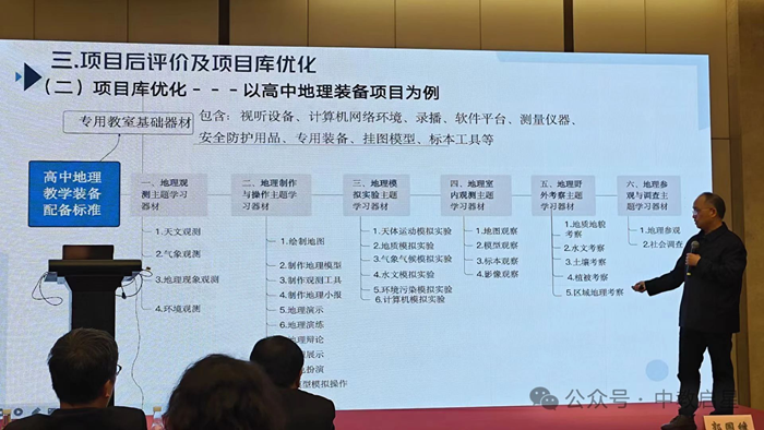 而項(xiàng)目庫(kù)優(yōu)化的案例則是以“高中地理裝備”為例,因?yàn)槟壳暗乩韺?shí)驗(yàn)裝備的發(fā)展相對(duì)理化生實(shí)驗(yàn)設(shè)備來(lái)說(shuō),有其獨(dú)特的學(xué)科特征和裝備普及階段。所以,他的建議是: