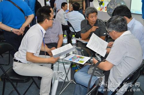 (參觀者在中教啟星展位探討“數學探究實驗室方案”)