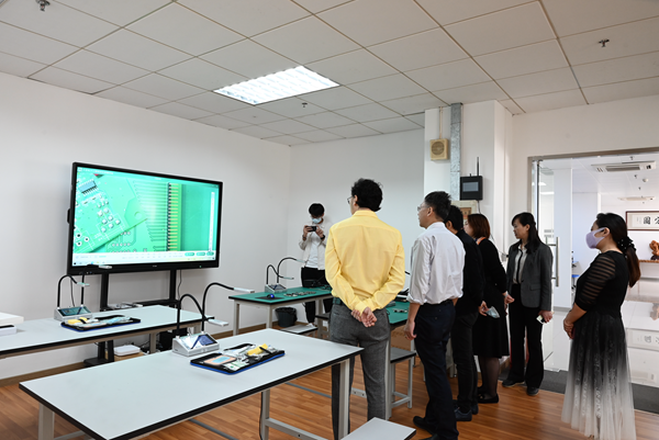 廣東省教育裝備行業協會王自成會長、王桂花秘書長,廣東省國學教育促進會路琦秘書長一行深度體驗了無線全錄播、強交互專遞課堂、理化生實驗教考系統的實際運用。