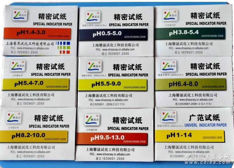 1,pH0.5-5.0:精度為顯色反應間隔0.5,分變色域pH:0.5、1.0、1.5、2.0、2.5、3.0、3.5、4.0、4.5、5.0,共10檔。 2,pH1.4-3.0:精度為顯色反應間隔0.2~0.5,分變色域pH:1.4、1.7、1.9、2.1、2.5、3.0,共6檔。 3,pH3.8-5.4:精度為顯色反應間隔0.2~0.3,分變色域pH:3.8、4.1、4.4、4.6、4.8、5.1、5.4、5.4以上,共8檔。 4,pH5.4-7.0:精度為顯色反應間隔0.2~0.4,分變色域pH:5.4以下、5.4、5.8、6.2、6.4、6.7、7.0、7.0以上,共8檔。 5,pH5.5-9.0:精度為顯色反應間隔0.5,分變色域pH:5.5、6.0、6.5、7.0、7.5、8.0、8.5、9.0,共8檔。 6,pH6.4-8.0:精度為顯色反應間隔0.2~0.3,分變色域pH:6.4、6.7、7.0、7.2、7.5、7.7、8.0、8.0以上,共8檔。 7,pH8.2-10:精度為顯色反應間隔0.2~0.4,分變色域pH:8.2、8.5、8.8、9.0、9.3、9.7、10.0、10.0以上,共8檔。 8,pH9.5-13:精度為顯色反應間隔0.5,分變色域pH:9.5、10.0、10.5、11.0、11.5、12.0、12.5、13.0,共8檔。 |