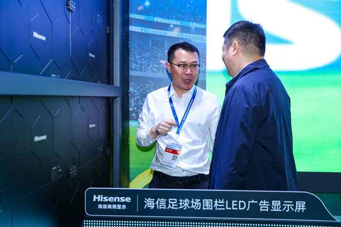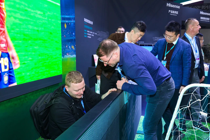 體育場(chǎng)場(chǎng)景則是還原了線下體育觀賽,通過“LED氛圍屏+SP系列圍欄屏”組合的方式,打造身臨其境的觀賽體驗(yàn)。作為世界杯、歐洲杯等多屆世界大型體育賽事的贊助商,海信LED產(chǎn)品在全球多個(gè)大型專業(yè)足球場(chǎng)落地,為球迷打造更加沉浸式的觀賽體驗(yàn)。另外,觀眾們還可近距離體驗(yàn)海信多款小間距LED顯示屏,感受海信LED豐富的產(chǎn)品矩陣。
