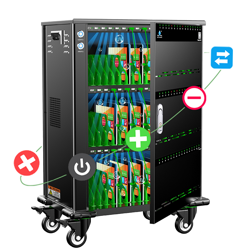 產品詳細介紹品牌:際慶科技 型號:SYNC48 Sync 48 招投(應標)參數: 功能參數: 1、48口直流充電USB 5V2.4A且每口穩定兼容HUB數據傳輸功能并對應配48條綠色數據線(充電IC芯片智能識別平板、手機等設備所需要的電流,安全、穩定、高效); 2、★每口獨立充電并具備智能LED轉燈功能(紅燈:充電狀態 中,綠燈:充滿/未連接),且有對應的數字序號; 3、★金屬按鈕開關,可過15A以上大電流,兼具電源開關和通電指示功能,單120mm風扇,搭配智能溫控系統,30℃±8自動啟停; 4、★主動式PEC節能開關電源,柜內置十重安全保護①雷擊保護②浪涌保護③過載保護④漏電保護⑤隔離保護⑥過流保護⑦過壓保護⑧短路保護⑨過充保護⑩灌流保護; 5、★自動消毒功能,紫外線+臭氧O₃雙重消毒,搭配金屬按鈕開關,啟動25min后自動關閉(選配項); 6、★定時充電具有電子顯示屏/多組設置/精準定時/倒計時設置(根據使用習慣隨意設定啟停時間段)(選配項); 7、★支持數據同步功能,能批量一鍵安裝和卸載APP,支持文件分發、文件刪除、一鍵關機等智能化管控,監測設備實時充電狀態和電量等(選配項)。 結構參數: 1、★外形尺寸≤582*830*358mm(含腳輪、防撞角),工位容積為320*200*25mm ,頂邊圓弧(≥R8)設計; 2、★兩側設有ABS工程提手,柜體四個底角加裝凸高15mm軟塑防撞角,配裝 4個3寸帶剎車天然橡膠靜音腳輪(高度105mm); 3、★三層式全黑16(每層)工位設計,配裝ABS綠色隔斷,單開前門鎖,左側艙為電源管控封閉區; 4、★門板透明視窗部分與內部充電LED燈一一對應,且有相應的數字序號,前門板與側板設有對流孔,通風散熱。 產品資質: ①★整機CCC認證(原廠蓋章證明) ②★具有商標(國際分類20和9)證書(原廠蓋章證明) ③★具有軟件著作權(原廠蓋章證明) ④★具有ISO9001:2015質量管理體系認證(原廠蓋章證明) ⑤★具有產品專利證書(原廠蓋章證明) ⑥★具有AAA企業信用等級證書(原廠蓋章證明)