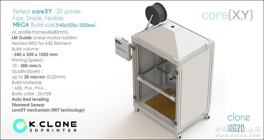 產品詳細介紹韓國原裝進口Kclone3D打印機x1020 打印尺寸540x520x1020 (XxYxZ)mm 購機贈送3KG ABS,SD卡,以及高速USB打印線 [clone - X1020] 規格表 打印 打印技術 : 熔融沉積造型(Fused deposition modeling,FDM) 打印尺寸: 540(x) X 520(y) X 1020(z)mm 打印速度: Max 300 mm/sec 接口類型: USB, SD-CARD(32G지원-FAT32) 細絲直徑: 1.75 mm 噴嘴直徑: 0.4 mm 層精度: 0.02 - 0.6 mm 定位精度: Z : 0.001 mm | XY : 0.02 mm 適用原料: ABS, PLA, PVA, PCL, HDPE, PP, PMMA 電子 輸入電壓: AC90~132V / AC180~264V , 50/60 Hz 電源: 1000watts 軟件 軟件: Cura for clone, pronterface ..... 操作系統: Windows, OS X, Linux 適用文件: STL, OBJ, Gcode 外觀 產品尺寸: 1000(x) x 850(y) x 1650(z)mm 重量: 100Kg 溫度 儲存溫度: 10℃ ~ 40℃ 噴嘴溫度: Max. 275℃ 加熱床溫度: Max. 135℃ 結構 主體 : 鋁 (40mmx80mm), 鐵 面板 : 鐵板 制造平臺 : AL10MM加熱床 – Kapton Tape XYZ 軸承: XY : LM 直線滑軌, Z : 球軸承 步進電機 : 1/16微步進1.8°步距角 選項 高級: 自動床找平 / 細絲更換傳感器 / LED 燈 / 門/ SD 卡 / ABS (3KG) 售后 質保: 自發貨之日起12個月(須受有關條款及細則約束)