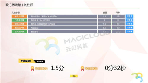 考試版按照真實中考實驗內容制作,設置評分系統,當學生操作完實驗之后,系統會根據學生操作的每一個環節、每一步給出評分,評分詳情中展示學生的扣分項與得分項,輔助學生了解自己的不足之處。學生可以通過模擬實驗進行練習直到掌握實驗內容,助力中學實驗考試。