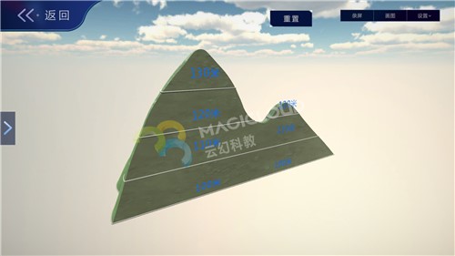 云幻科教VR地理仿真實驗資源制作等高線的地形模型,使用不同顏色標注不同海拔的等高線,便于學生理解等高線地形圖的繪制原理,通過不同的地形模型,引導學生認識各種地表形態的名稱、特點,輕松學習地理知識。