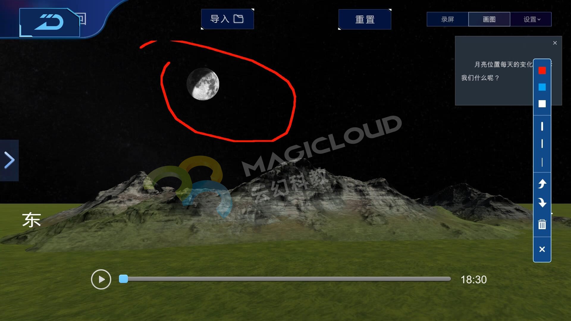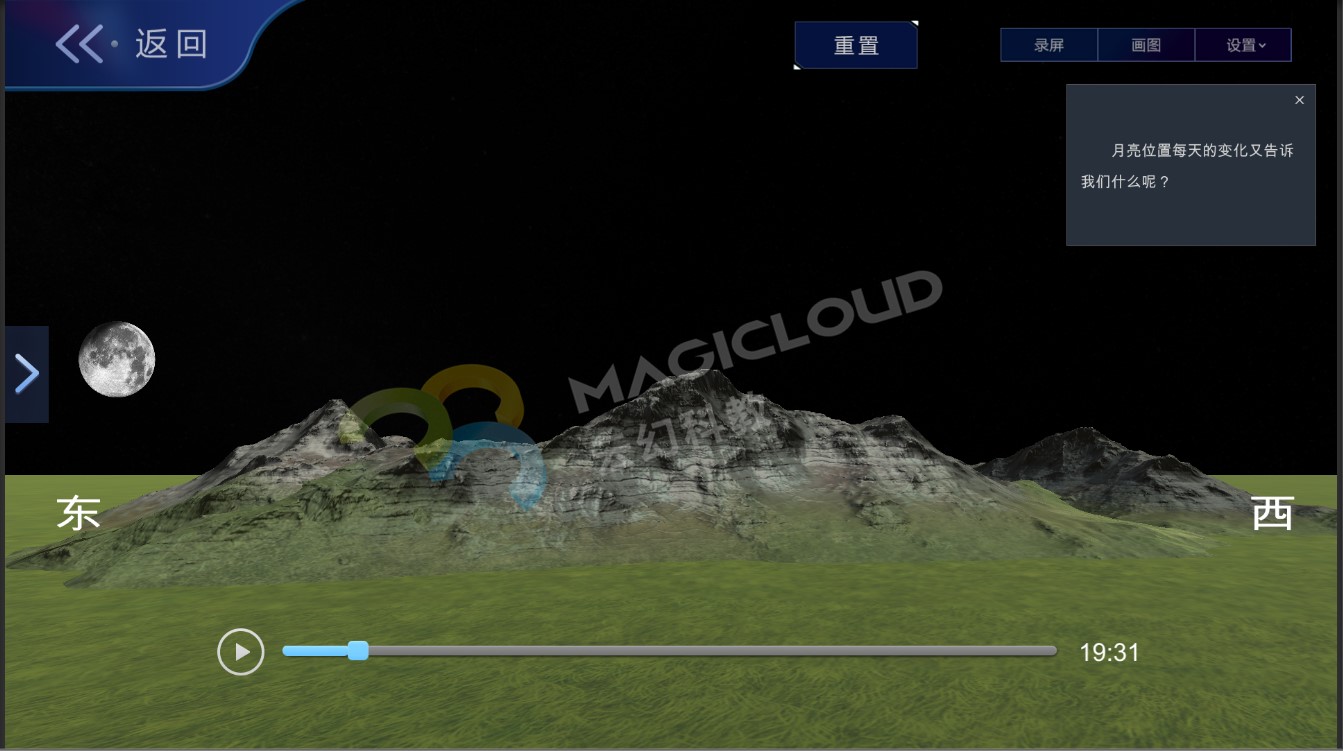 在月相變化教學中,月相變化的原理光憑教師的口頭講解,學生是很難理解的。這一主題屬于宏觀范疇,難以直接觀察,同時小學階段的學生空間想象能力不強,涉及到運動的內容時,就會更難理解。因此在教學中需要準備較多的模擬實驗、教學視頻資料等,此時就需要教師活用多媒體進行教學。那么有沒有哪款軟件貫穿整節課知識內容方便教師教學呢?答案當然是有的,云幻科教VR科學仿真實驗平臺。