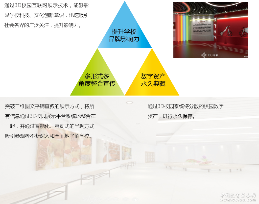 3D虛擬校博物館是應用虛擬現實技術及3D建模技術構建,針對學校教育教學成果展示、校園文化成果展示、對外宣傳展示、校園品牌建設而創意研發的。通過展覽館漫游、三維互動體驗的方式,將展廳、展板、展臺、藏品等展示在3D虛擬校博物館中,結合圖片、文字、陳列品、視音頻等資料,以網站或光盤為載體,實現互聯網三維虛擬展覽,全面展示學校風采!