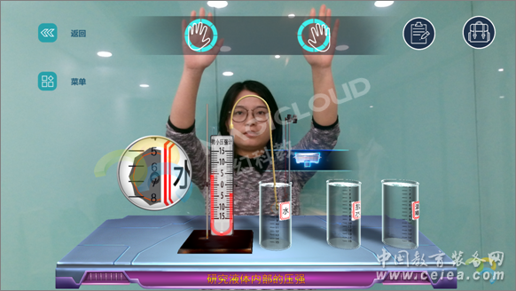 物理仿真實驗室綜合應用AIAR技術,通過3D建模虛擬再現真實的實驗場景,借助先進的體感交互設備Kinect進行虛實互動,將真實的實驗者與虛擬仿真的實驗器材結合到一個畫面里,實驗者實現無需佩戴任何體感設備,純手勢就可以進行實驗互動教學。