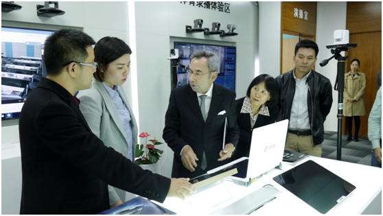 會長一行參觀了文香的產品陳列體驗區,在這里,會長親自體驗了文香的雙屏錄播,PAD錄播等最新機器,文香產品的精致與易用,讓會長贊嘆不已。同時還體驗了文香的人臉識別,體育錄播等產品。在體驗人臉識別部分時他談到,這就是他一直想要的東西,這個東西在未來將有無限可能。