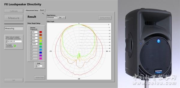 這項測試需要一個轉盤(揚聲器固定在上面)和連接至 FX100 的量測麥克風。定制的軟件執行校準并自動開始測量序列。揚聲器按設定的角度旋轉。并在每個位置觸發一次滑頻信號,麥克風進行測量。結果直接以圖表顯示。