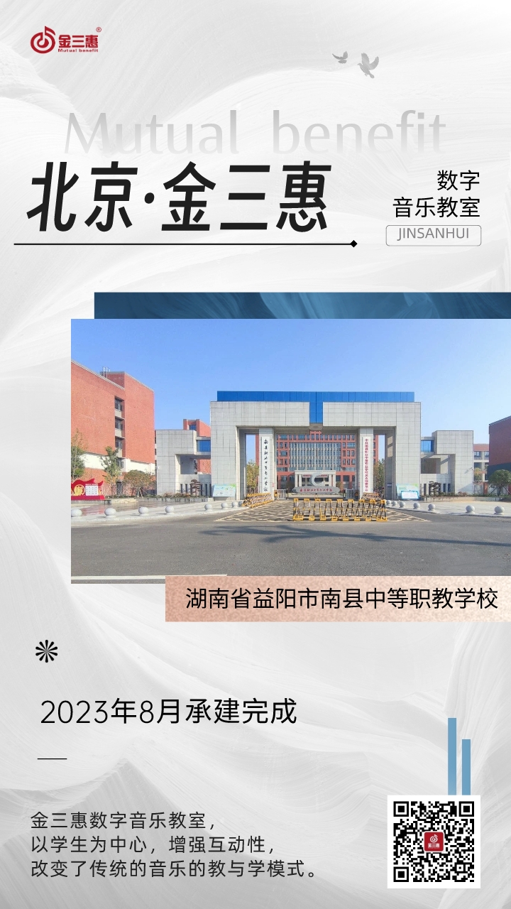 2023年8月,金三惠數字音樂教室走進湖南省益陽市南縣中等職教學校,為學生提供了30+1的電鋼琴教室,配備了金三惠電鋼琴教學系統、電鋼琴、數字音樂教學儀等教學教具等。