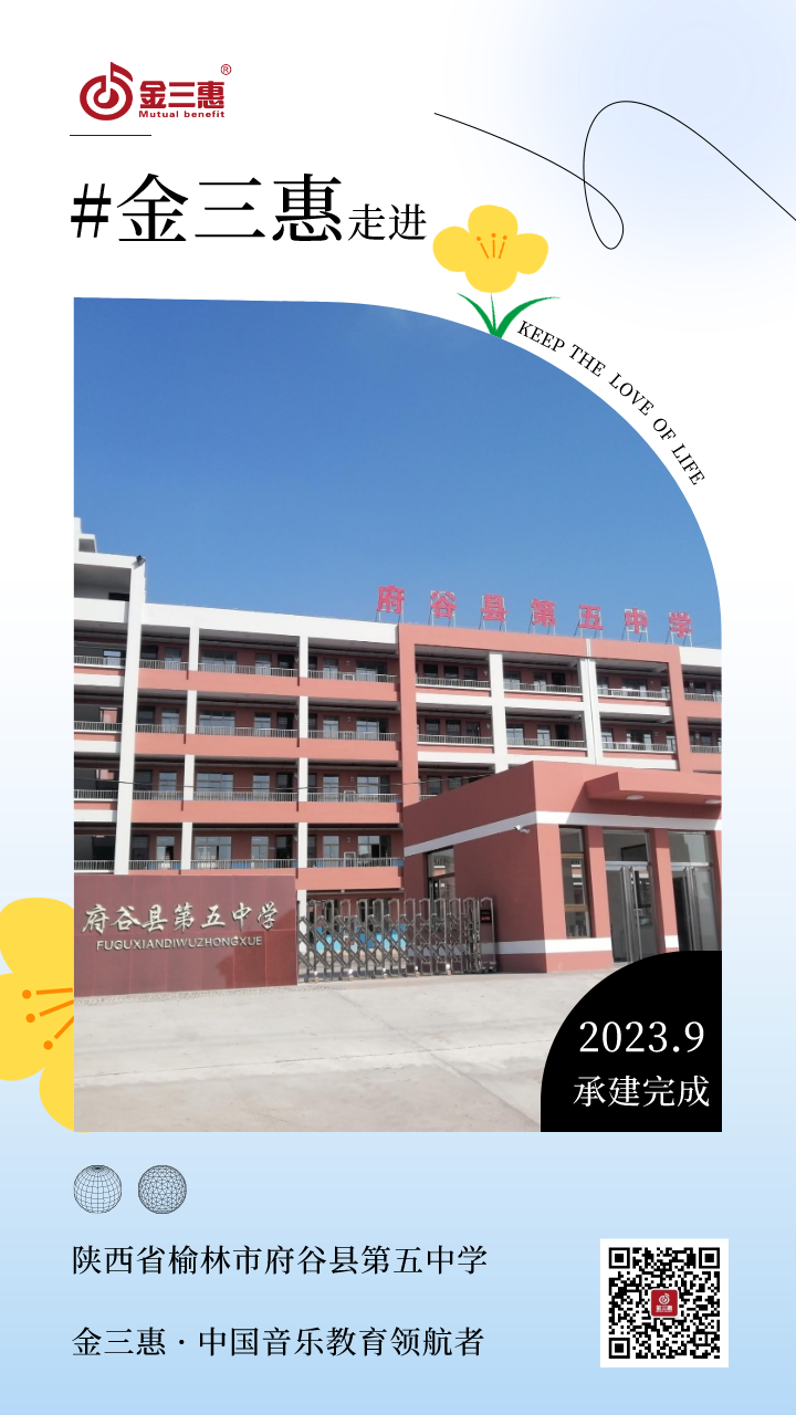 2023年9月,金三惠數字音樂教室走進陜西省榆林市府谷縣第五中學,為學生提供了28+1電鋼琴教室兩間,配備了金三惠電鋼琴教學系統、電鋼琴、數字音樂教學儀等教學教具等。