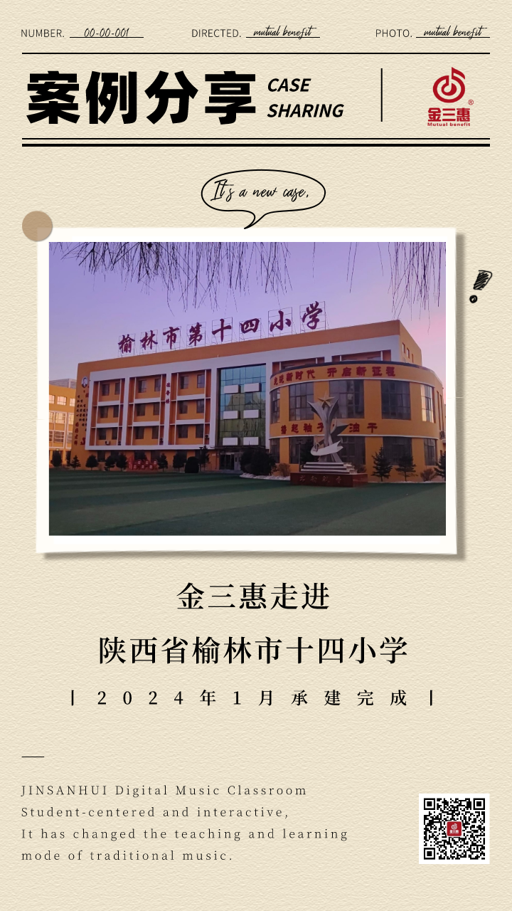 2024年1月,金三惠數字音樂教室走進陜西省榆林市十四小學,為學校提供了30+1的電鋼琴教室配備了金三惠電鋼琴教學系統、電鋼琴、數字音樂教學儀等教學教具等。