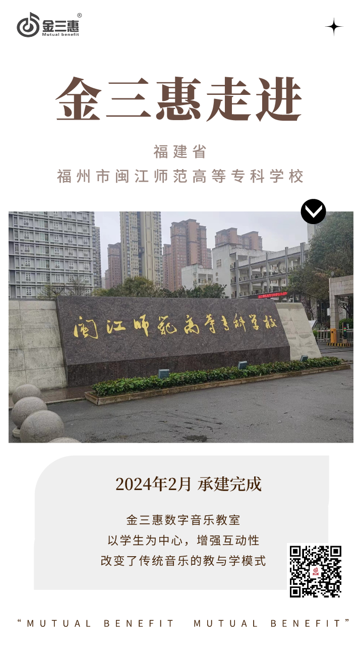 2024年2月,金三惠數字音樂教室走進福建省福州市閩江師范高等�?茖W校,為學校提供了43+1和40+1的電鋼琴教室,配備了金三惠電鋼琴教學系統、電鋼琴、數字音樂教學儀等教學教具等。