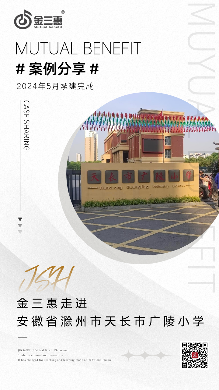2024年5月,金三惠數字音樂教室走進安徽省滁州市天長市廣陵小學,為學校提供了22+1的電鋼琴教室,配備了金三惠電鋼琴教學系統、電鋼琴、數字音樂教學儀等教學教具等。