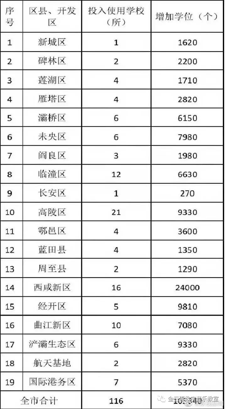 今天記者從西安市教育局了解到,西安市《2022年新建擴建中小學幼兒園建設計劃的通知》日前印發,明確2022年西安市擬投入使用新建、擴建中小學及幼兒園116所,共增加學位10.5萬個。《通知》規定,將2022年擬投入使用的新建、擴建中小學及幼兒園項目列入當年市考項目內容進行考核。2022年7月1日前,要確保工程項目全面竣工、設備配備項目采購安裝到位、空氣質量檢測全部完成,切實保證2022年秋季開學投入使用。