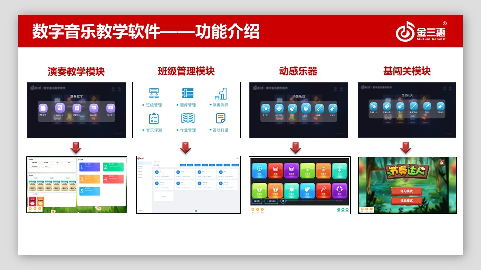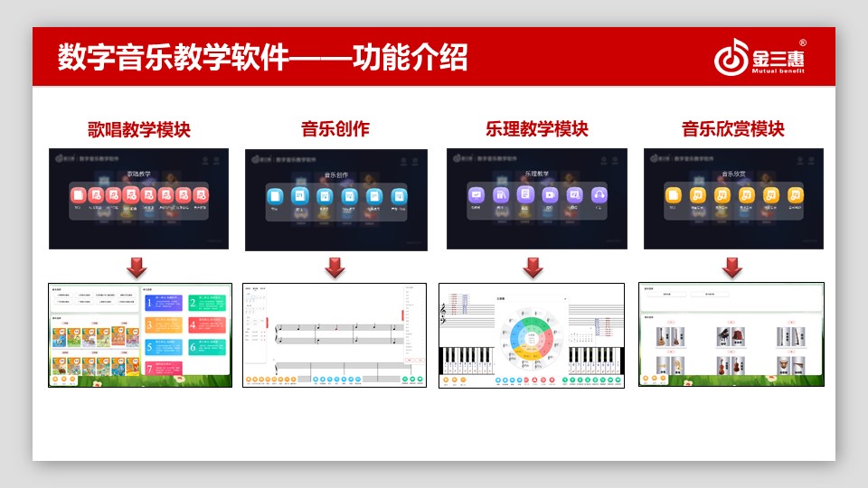 金三惠提供一站式「新常態音樂教室解決方案」「數字音樂教育綜合解決方案」,熱銷產品有:數字音樂教學軟件、美育測評訓練平臺、電鋼琴/電子琴教學管理軟件、電鋼琴教室、智慧音樂素養教室、數字電教板、各大類音樂器材、音樂教學設備等。為區域音樂教育提供管、教、學、評、練綜合平臺,打造智慧平臺+智能硬件+數字資源+智能管控+教學評價為一體的全場景學習生態,實現區域數字化音樂教育轉型。