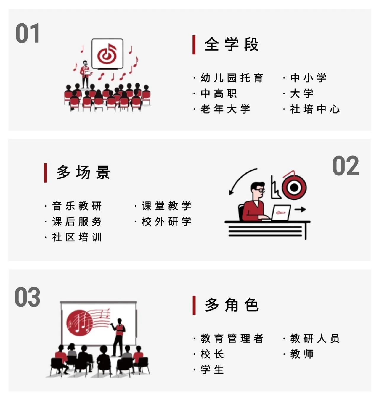 覆蓋音樂教育全學段(幼兒園托育、中小學、中高職、大學、老年大學、社培中心)、多場景(音樂教研、課堂教學、校外研學、課后服務、社區(qū)培訓)、多角色(教育管理者、教研人員、校長、教師、學生)。
