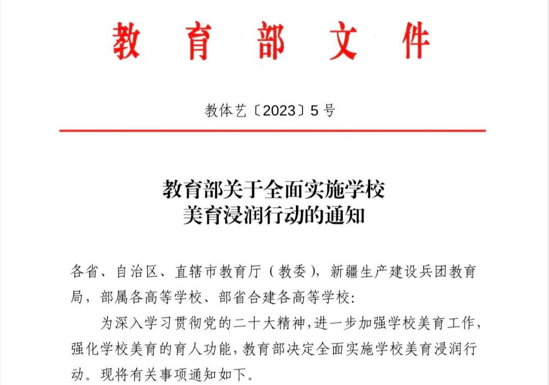 2023年12月20日,教育部下發(fā)《關于全面實施學校美育浸潤行動的通知》(教體藝〔2023〕5號),在全國“決定全面實施學校美育浸潤行動”,包括實施美育教學改革深化、教師美育素養(yǎng)提升、藝術實踐活動普及、校園美育文化營造、美育評價機制優(yōu)化、鄉(xiāng)村美育提質發(fā)展、美育智慧教育賦能、社會美育資源整合等,進一步加強學校美育工作,強化學校美育的育人功能。
