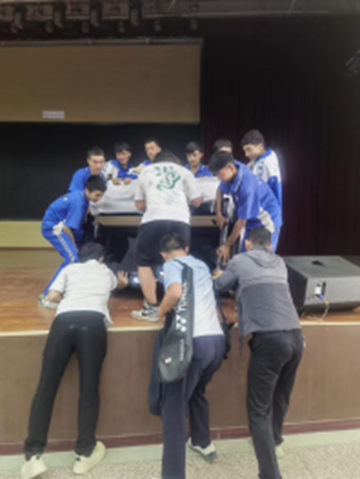 師生齊心協力將鋼琴搬上講臺