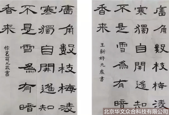 2018年,山東淄博華僑城小學(xué)遴選了部分喜愛書法的學(xué)生,開設(shè)了軟筆書法社團(tuán)。在已有隸書學(xué)習(xí)的基礎(chǔ)上,強(qiáng)化基本筆法,并通過(guò)華文眾合智慧書法教室指導(dǎo)學(xué)生進(jìn)行集字練習(xí)和創(chuàng)作。教學(xué)中,老師針對(duì)不同學(xué)生的書寫情況進(jìn)行具體指導(dǎo),通過(guò)范寫、比對(duì)、點(diǎn)評(píng)等方式幫助學(xué)生不斷提升書寫水平。