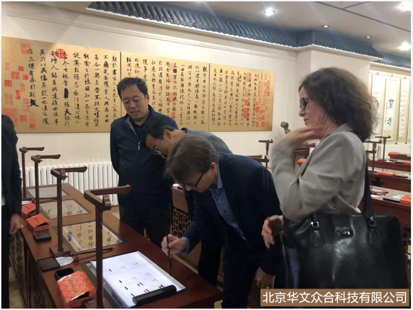 Eranpalo(妮娜·艾安保羅)院長及訪問團隨行人員到青島西海岸新區育才初級中學進行友好訪問,參觀并體驗學校由北京華文眾合科技有限公司打造的智慧書法教室。兩位外賓對書法熱情極高,通過體驗,近距離感受了中華民族優秀傳統文化。