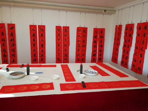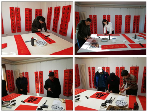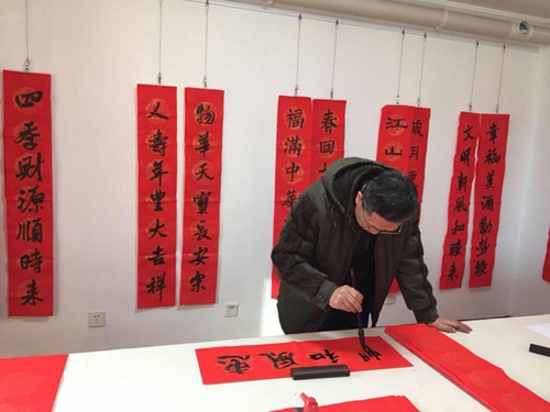 中國書法家協(xié)會(huì)理事高軍法在大家期待的掌聲中,開始揮毫潑墨。一幅幅寫滿祝福的春聯(lián)躍然于紅紙之上,濃濃的情意、真誠的祝福溢于字里行間。他談到:“寫春聯(lián)寄托著一種文化情懷,看似寫字,其實(shí)是總結(jié)過去一年的收獲,對(duì)新的一年的展望和期盼。”與印刷春聯(lián)不同的是,用傳統(tǒng)的筆墨把想說的話寫進(jìn)春聯(lián)里掛起來,不僅美觀,寓意也好,這就是書法結(jié)合春聯(lián)所具有的獨(dú)特魅力。