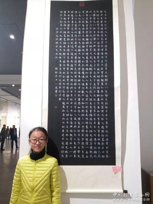 在入圍的近5000幅作品中,經(jīng)過初評、終評、現(xiàn)場復(fù)試三個(gè)環(huán)節(jié)的評選,最終,來自青島市西海岸新區(qū)第三實(shí)驗(yàn)小學(xué)五年級三班的劉昭君同學(xué)脫穎而出,喜獲小學(xué)組書法比賽一等獎(jiǎng)第一名的好成績;張永銘、劉碩、王小涵三位同學(xué)進(jìn)百強(qiáng),獲小學(xué)組優(yōu)秀獎(jiǎng);馬先勇老師榮獲教師組二等獎(jiǎng)。其中,劉昭君同學(xué)作為學(xué)生代表在現(xiàn)場頒獎(jiǎng)會(huì)上作了經(jīng)驗(yàn)分享,贏得臺下一片贊譽(yù)!