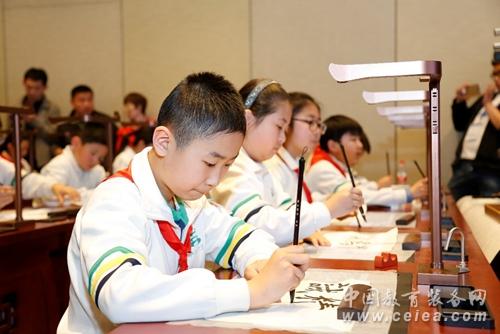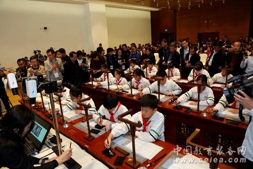 會上,北京天壇東里小學的老師和同學們使用北京華文眾合科技有限公司開發的“智云+”數字書法教室,使用傳統的筆墨紙硯,結合信息化技術,通過示范、互動、講評、臨摹練習,為大家展示了一堂別開生面的書法課。
