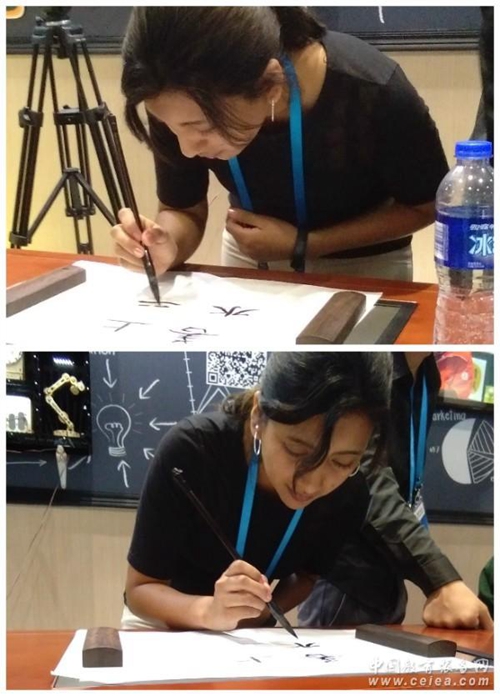 有了華文眾合交互式臨摹臺(tái),外國(guó)友人也能立即上手寫(xiě)出書(shū)法作品。