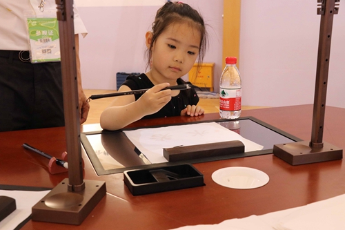 此次,華文眾合帶來的新產品——第五代智慧書法教室大有看頭。據了解,這是一整套軟硬件結合的產品,其研發以提升書法教育水平為出發點。