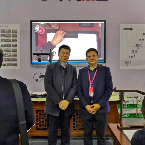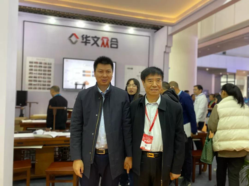 寧夏教育裝備行業(yè)協(xié)會(huì)會(huì)長(zhǎng)黃樺(右)蒞臨華文眾合展位