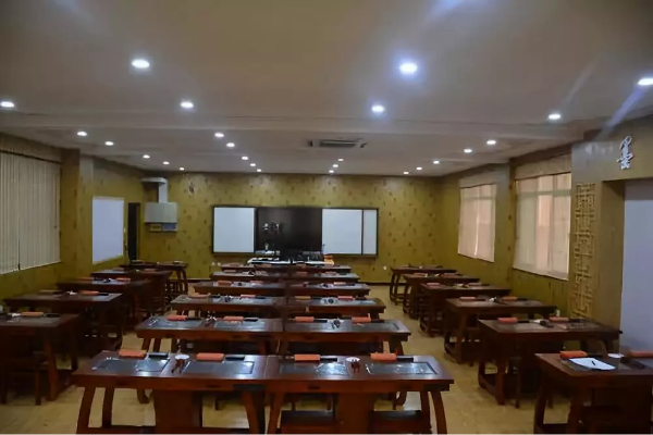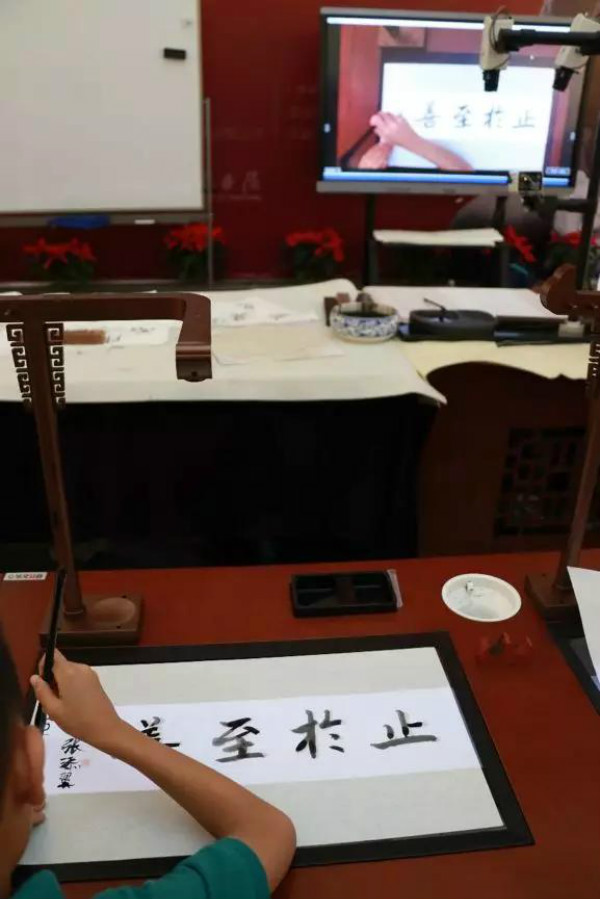 教室大氣優雅、古色古香,可同時容納46名學生練習書法,每張書法桌都配備了毛筆、筆架、墨盒、鎮尺和練習紙等,讓人感受到濃濃的書香氣息。