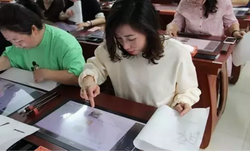 培訓(xùn)過程中,講師通過華文眾合智慧書法教室的多維互動系統(tǒng)與直播系統(tǒng),將書寫示范與其中一位老師的書寫過程,高清同步到每位老師面前的交互式數(shù)字臨摹臺上,并在電腦上現(xiàn)場進(jìn)行圈點(diǎn)、評價。在臨摹臺上,老師們用毛筆蘸著墨汁,鋪上普通宣紙就可以進(jìn)行書寫,防水、耐磨、自適應(yīng)調(diào)節(jié)亮度的交互式數(shù)字臨摹臺讓老師們眼前一亮。