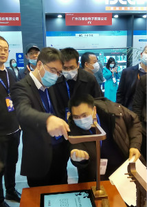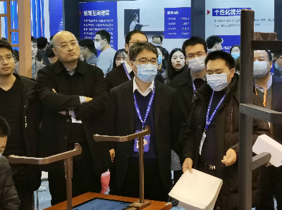▲華文眾合工作人員向浙江省教育廳副廳長陳峰講解設備
