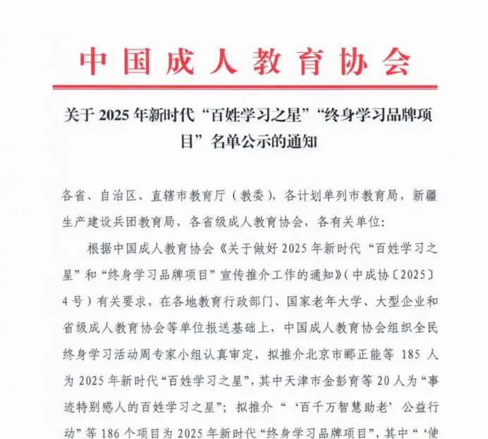 全國新時代 “終身學習品牌項目” 是我國教育領域最具影響力的國家級獎項之一,由中國成人教育協會主辦,教育部相關部門提供政策支持。該項目聚焦 “學習型社會建設” 國家戰略,旨在表彰 “在全民終身學習領域具有示范性、創新性和廣泛影響力”的標桿案例。