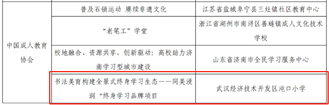 近日,經過各省積極推薦和全國評選,備受矚目的2025年全國新時代“終身學習品牌項目”推介名單正式公布。華文眾合優秀案例校武漢經開區沌口小學打造的“同美浸潤”書法美育項目,以構建全景式終身學習生態為特色,在湖北省14個參評項目中脫穎而出,成功入選2025年全國新時代“終身學習品牌項目”,成為全省6個獲此殊榮的唯一一所小學。