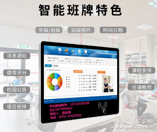產(chǎn)品詳細(xì)介紹產(chǎn)品簡介 1. 可為學(xué)校定制外觀logo,將logo印制到指定位置。 2.均采用全新工業(yè)級液晶屏。 3.超薄壁掛設(shè)計,一體化成型外殼,鋼化玻璃保護 4.采用高級電容觸摸技術(shù),多點觸摸,無需激活力(觸摸系列) 5.電子班牌屏幕表面保護,硬度莫氏7級 6.屏保觸摸激活功能(觸摸系列) 7.零維護設(shè)計,遠程自定義電子班牌的開關(guān)機時間、重啟、音量調(diào)節(jié),無需人工干預(yù)。 8. 支持屏幕旋轉(zhuǎn) 9.高性能運行配置 10.可完美支持PPT、WORD、EXCEL等OFFICE文件的導(dǎo)入播放; 11支持各種多媒體格式,包含:MKV, AVI, RM、WMV、JPEG, BMP、PNG、MP3等 電子班牌運用 (1)上課模式 為每個教室配置一個前端顯示觸摸屏,安裝在教室門口,用來顯示班級信息,當(dāng)前課程信息,教室環(huán)境信息以及學(xué)校的通知信息,為學(xué)生和老師提供了便利。 屏幕區(qū)域說明 ①、班牌信息,電子班牌功能,避免學(xué)校每年更換班牌,直接通過軟件設(shè)置即可完成。 ②、課程信息,每個屏維護一張本班的課程表,可自動根據(jù)時間顯示當(dāng)前的課程,授課老師以及當(dāng)節(jié)課的上課時間,也可點擊“課表”按鈕查看詳細(xì)課表。 ③、環(huán)境信息,實時顯示本教室的溫度,濕度,CO2濃度,光照強度,PM2.5等信息。 |