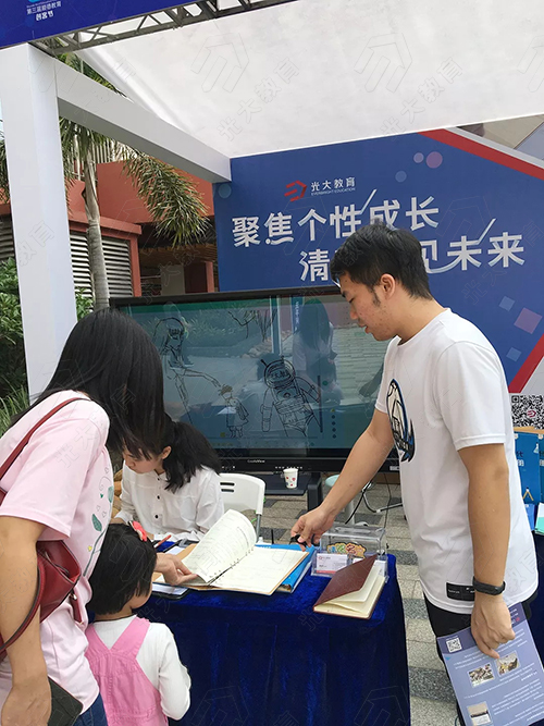 “我可以試試嗎?”參與創客節競賽的學生拿起電子筆,帶著興奮與期待咨詢展位上的工作人員。在光大教育的展位前圍著不少的學生、老師、家長,不少人興致勃勃地在紙上寫寫畫畫,筆跡同步呈現在電子屏上,引起他們的驚嘆與好奇。