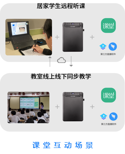 方案采用“智能手寫板+紙筆互動課堂教學軟件”為主體,結合第三方直播軟件組成新型混合式紙筆教學形態。通過線上線下同步混合交互式教學模式,解決居家網課與在校課堂的融合教學問題,形成學生學習過程性評價和學情分析,助力課堂教學改革,提升課堂效能。