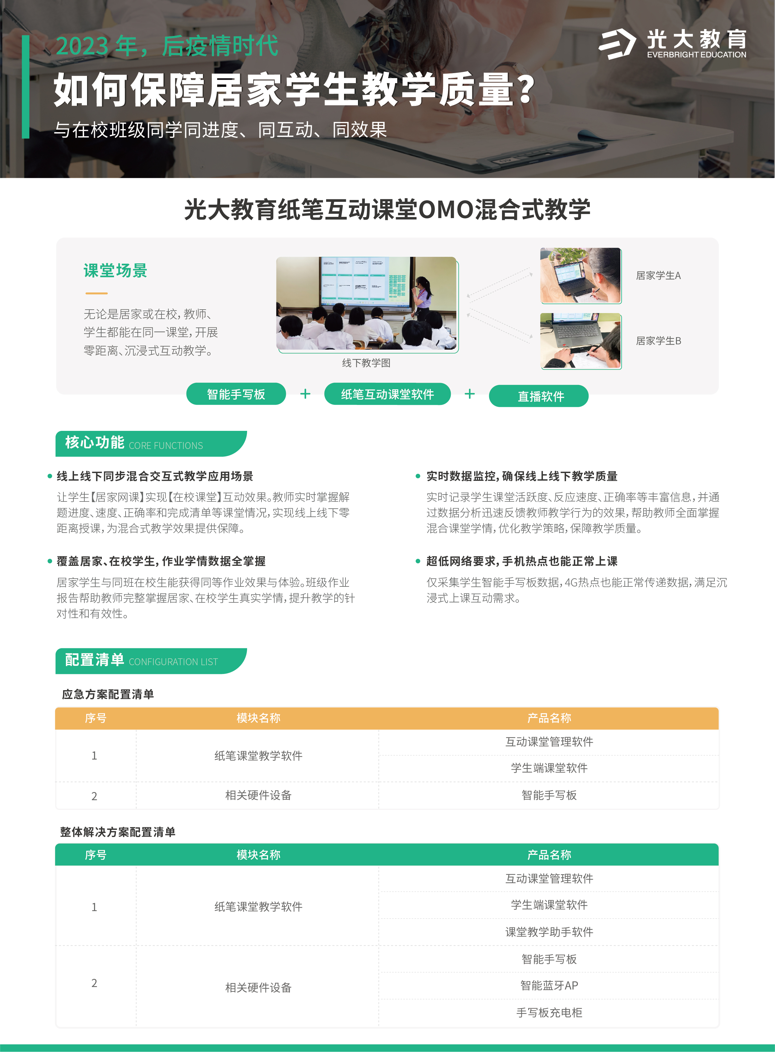 光大教育始終致力于為教育行業提供優質信息化產品與服務。“紙筆互動課堂OMO混合式教學解決方案”適合疫情最新變化,為學校快速搭建混合交互式教學管理機制,助力學校精準防控疫情的同時,減輕學生負擔,提高教學效率,保障教學質量。
