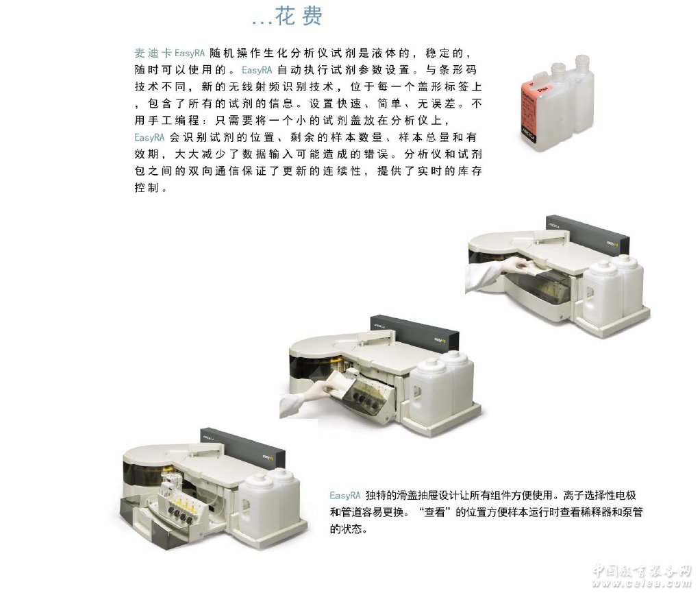 麥迪卡EasyRA是一款適應于小型實驗室多樣化需求的全自動的生化分析儀。 由于EasyRA簡單而直觀的用戶界面,實驗室技術人員可以通過最少的培訓成為最專業的人員。4中色彩的圖標讓技術人員輕松訪問分析儀功能。EasyRA操作簡單,運行速度快。簡單友好的用戶界面清晰地反映機器運行進程,用戶也可以進行改動。技術人員可在8分鐘內進行臨時標本分析。同時運行兩個工作列表,快捷檢查試劑和測試管的庫存準備下一個測試,這樣以來節省了寶貴的時間。 EasyRA臨床生化分析儀可以對可更換部件進行前所未有的訪問,獨特的滑屜設計簡化了維修。無線射頻技術(RFID)替代了手工編制試劑程序。當小巧的試劑包嵌入到試劑區域任何位置時,EasyRA就可以確認試劑包位置、剩余測試量、容積及失效期。 EasyRA的測試速度為150次/小時,(集成ISE超過300次),24個樣本位,24個試劑位。EasyRA是實驗室臨床生化項目檢測是最方便的選擇。 麥迪卡為中小型實驗室提供低成本、易使用、全自動的急診生化分析儀。EasyRA就是這樣一款高質量低成本的生化分析儀。 EasyRA有一個簡單敏感的觸摸屏用戶界面,操作更簡單,方便培訓任何水平的用戶。用戶界面方便用戶查詢所有的維修記錄。模塊化的設計方便用戶和服務工程師進行維修,保證了最大儀器運行時間。試劑應用了最新的無線射頻識別(RFID)芯片,記錄了所有測試信息,提醒用戶進行校準,自動使用情況追蹤和試劑存量管理。 |